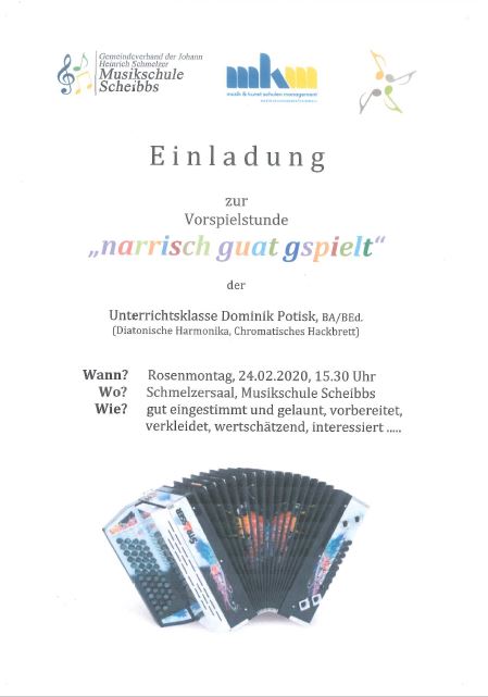 Die Stadtkapelle und die Schmelzer Musikschule Scheibbs laden herzlich zum Musiktheater am Samstag, 15. Februar um 14:00 Uhr in die Turnhalle ein. Erlebe eine spannende Geschichte. "Mimi & Musicus" begeben sich auf die Reise um das Rätsel des Maskenballs zu... Weiterlesen →